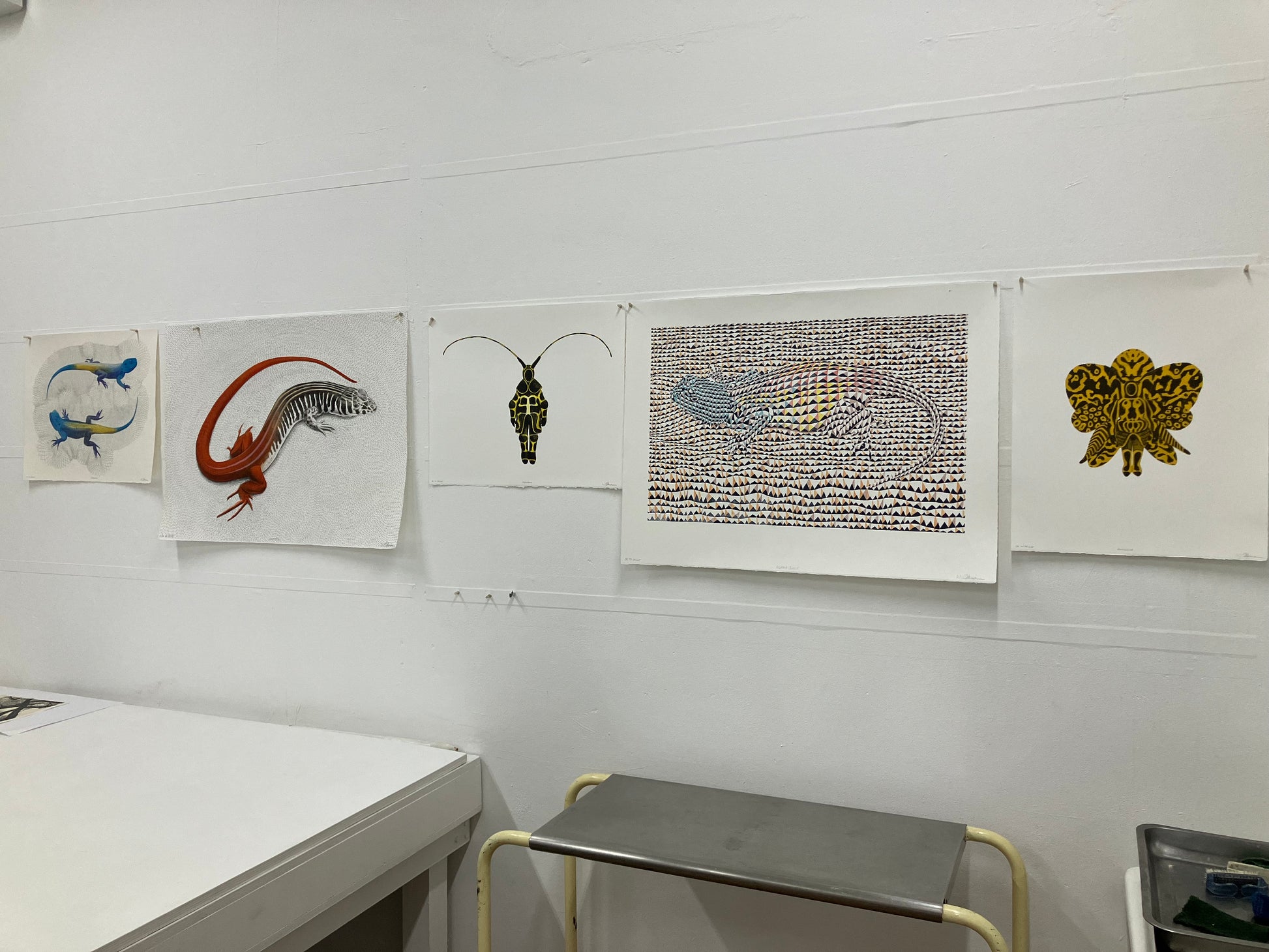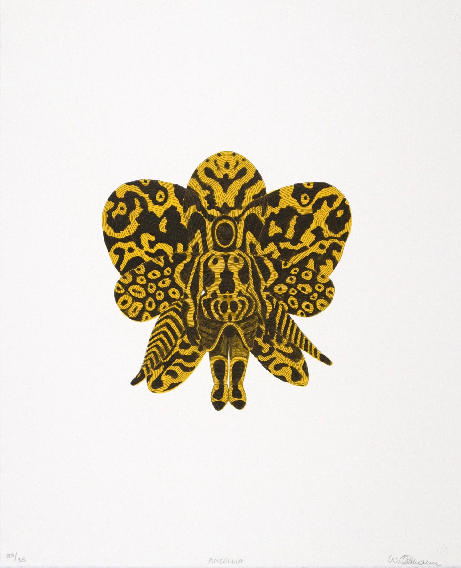 Connected to Oltmann's Instar body of work, these lithographs continue Oltmann’s exploration of natural transformation and interconnectedness. The prints link to his sculptures, crafted from intricately coiled aluminium wire, anodised gold, and black enamel, the works take the form of armour-like skins that merge human, insect, and plant characteristics. Their shell-like structures evoke cycles of moulting and renewal, while vivid colour and texture reference adaptive strategies in nature—camouflage, mimicry, and attraction. Through these hybrids, Oltmann dissolves boundaries between species, inviting reflection on regeneration, interdependence, and the shared vitality of living forms.