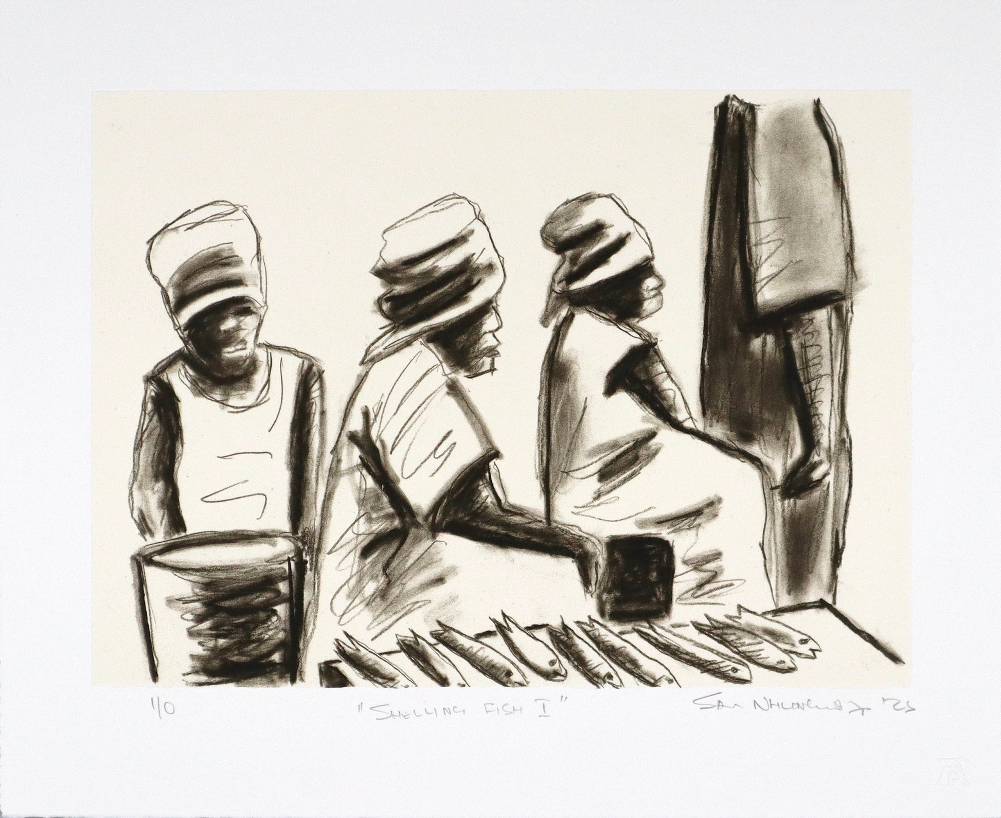 He spent time exploring the markets and beaches of Gorée, capturing what delighted him in his sketchbook. On the beach, he joined an impromptu soccer game with local boys. He recalls, "I regretted it—those boys are fit and didn't seem to notice how much your feet sink into the soft sand. I struggled to keep up with them!" Nhlengethwa will never part with his sketchbooks, so he chose to turn some sketches from the residency into ten lithographs that depict daily life on Gorée, a place now very different from its history of slavery. These prints are a rare glimpse into an artist's sketchbook!
