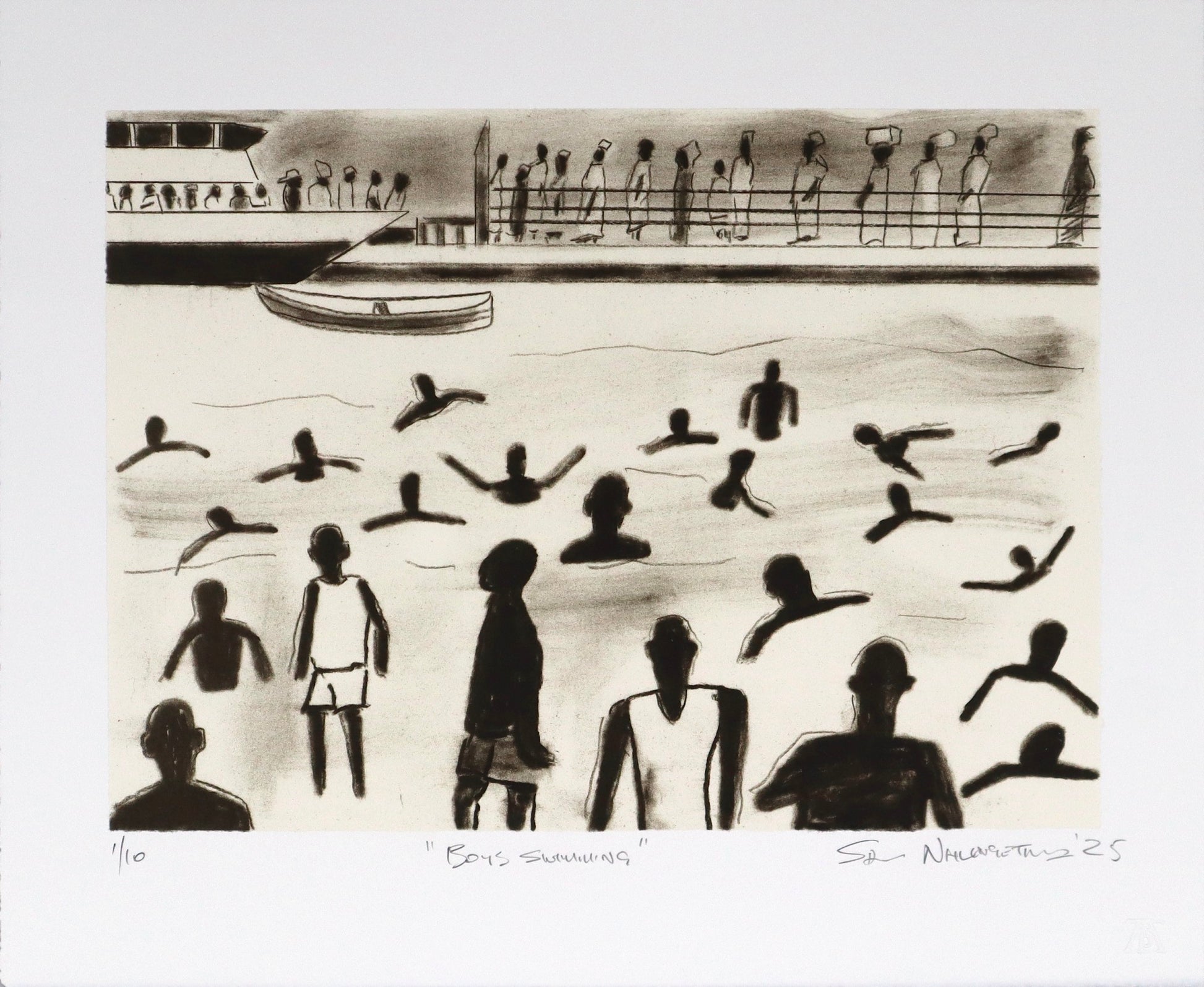 He spent time exploring the markets and beaches of Gorée, capturing what delighted him in his sketchbook. On the beach, he joined an impromptu soccer game with local boys. He recalls, "I regretted it—those boys are fit and didn't seem to notice how much your feet sink into the soft sand. I struggled to keep up with them!" Nhlengethwa will never part with his sketchbooks, so he chose to turn some sketches from the residency into ten lithographs that depict daily life on Gorée, a place now very different from its history of slavery. These prints are a rare glimpse into an artist's sketchbook!