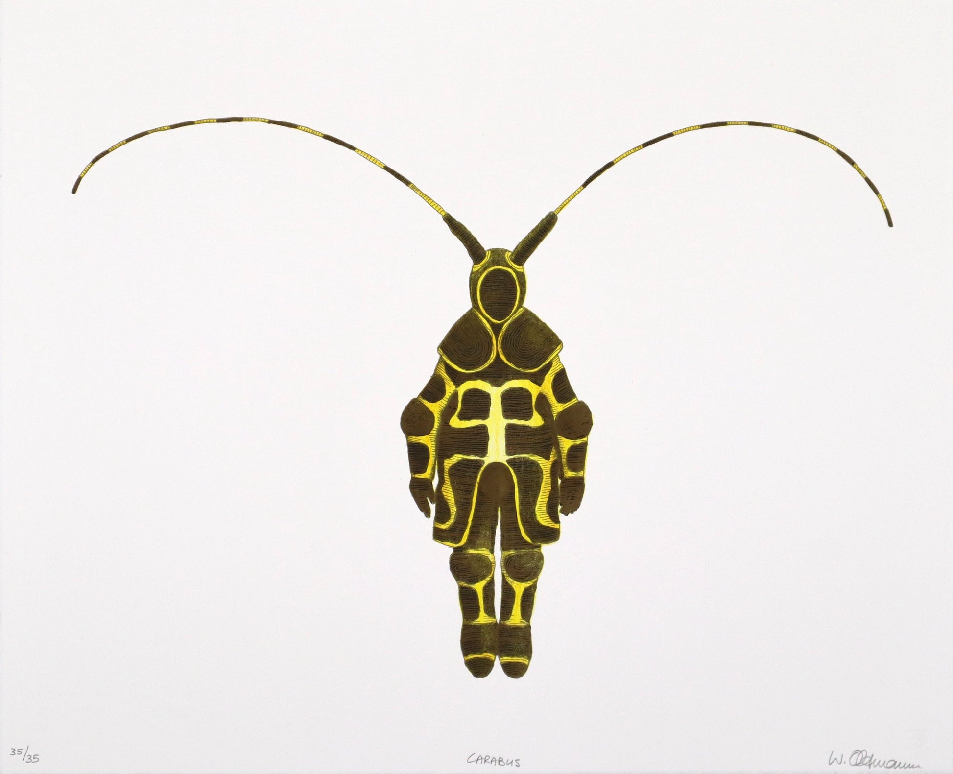 Connected to Oltmann's Instar body of work, these lithographs continue Oltmann’s exploration of natural transformation and interconnectedness. The prints link to his sculptures, crafted from intricately coiled aluminium wire, anodised gold, and black enamel, the works take the form of armour-like skins that merge human, insect, and plant characteristics. Their shell-like structures evoke cycles of moulting and renewal, while vivid colour and texture reference adaptive strategies in nature—camouflage, mimicry, and attraction. Through these hybrids, Oltmann dissolves boundaries between species, inviting reflection on regeneration, interdependence, and the shared vitality of living forms.