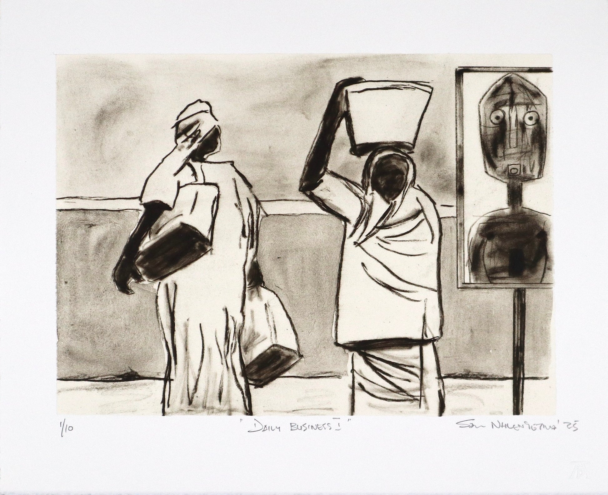 He spent time exploring the markets and beaches of Gorée, capturing what delighted him in his sketchbook. On the beach, he joined an impromptu soccer game with local boys. He recalls, "I regretted it—those boys are fit and didn't seem to notice how much your feet sink into the soft sand. I struggled to keep up with them!" Nhlengethwa will never part with his sketchbooks, so he chose to turn some sketches from the residency into ten lithographs that depict daily life on Gorée, a place now very different from its history of slavery. These prints are a rare glimpse into an artist's sketchbook!