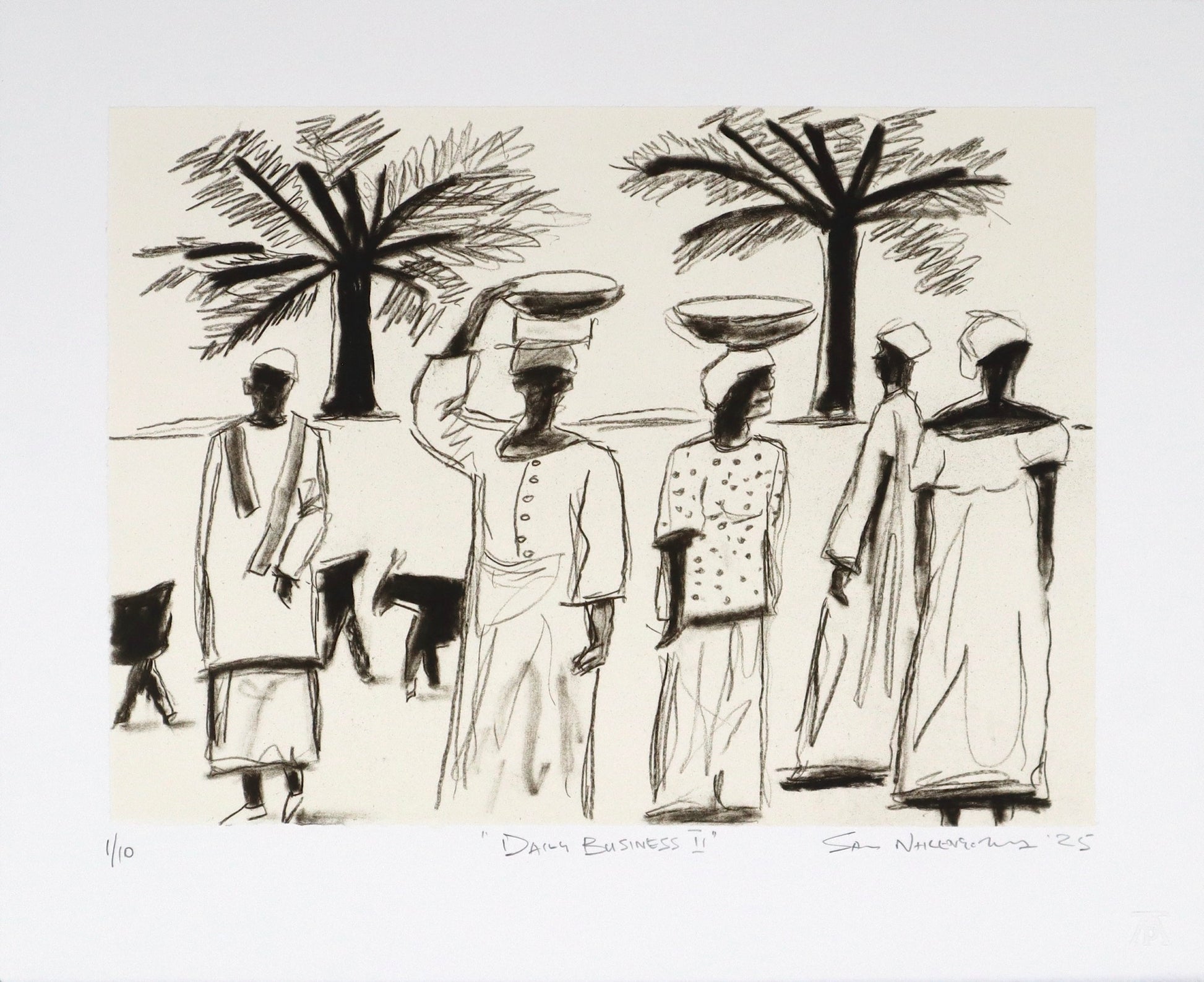 He spent time exploring the markets and beaches of Gorée, capturing what delighted him in his sketchbook. On the beach, he joined an impromptu soccer game with local boys. He recalls, "I regretted it—those boys are fit and didn't seem to notice how much your feet sink into the soft sand. I struggled to keep up with them!" Nhlengethwa will never part with his sketchbooks, so he chose to turn some sketches from the residency into ten lithographs that depict daily life on Gorée, a place now very different from its history of slavery. These prints are a rare glimpse into an artist's sketchbook!